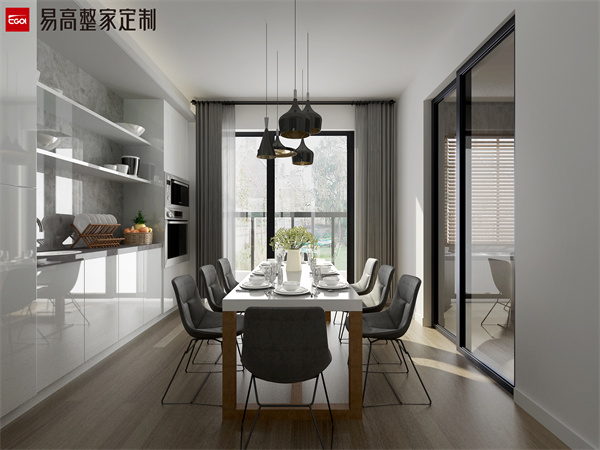 餐廳空間空間如果顯得比較空曠可以定制一個大的餐邊柜,不僅可以擺放餐具、飾品以及一些擺放,還可以收納一些日常使用的小家電,比如咖啡機等等,讓餐廳也多一道賞心悅目的風景線,提高生活的幸福感。