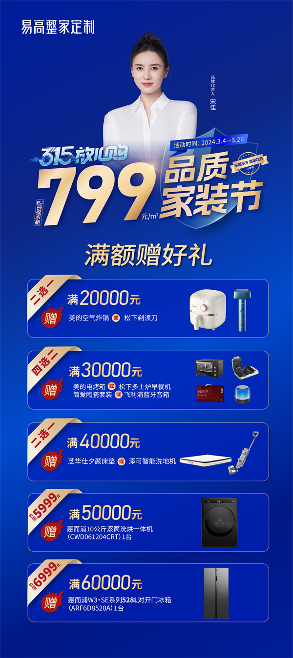 除了價(jià)格優(yōu)惠,易高整家定制還開(kāi)啟了“滿(mǎn)額贈(zèng)好禮”模式!3.15活動(dòng)期間,滿(mǎn)20000元送美的空氣炸鍋1臺(tái)/松下剃須刀;滿(mǎn)30000元送美的電烤箱/松下多士爐早餐機(jī)+簡(jiǎn)愛(ài)陶瓷套裝/飛利浦藍(lán)牙音箱;滿(mǎn)40000元送芝華仕床墊1張/添可智能洗地機(jī)...除此之外,還有很多超值福利哦!