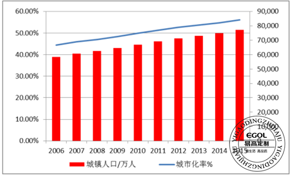 現全屋定制是整個家具市場的看點,在此之前,定制家具行業將會不斷擴充定制品類,廠家不斷招商,市場不斷轉型是未來主要的發展趨勢,據統計,國內定制家具行業滲透率只有20%,未來發展空間巨大,穩步提升是近年發展景象,未來可能因條件改變不斷刺激行業發展,據國務院發布規劃條例中,2020年我國城鎮化建設將達到60%,對于家居行業是不是個好消息呢?
