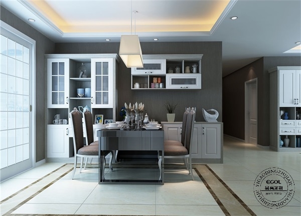 餐廳與客廳沒有做明顯空間分隔,空間視野上顯得更加開闊,餐邊柜也是靠墻制作,柜體顏色與客廳保持一致,高低吊柜與開放式儲物格相得益彰。