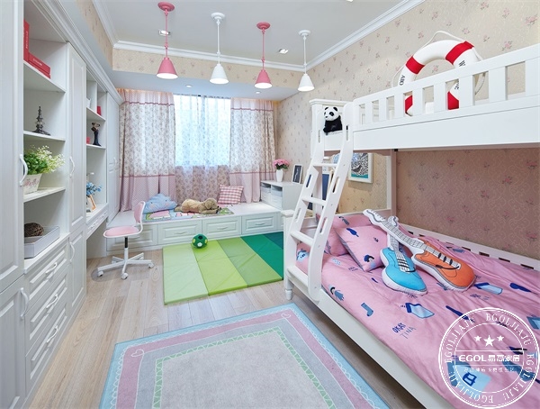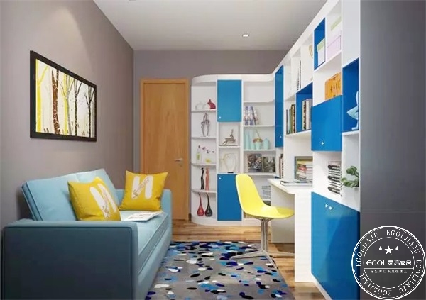幼兒時期通常是書房和房間一體,這時候多開發(fā)孩子腦洞,培養(yǎng)孩子的色彩感知能力和動手能力,因此書房空間自然采光要充足,色彩搭配合理,把創(chuàng)造快樂空間的主動權(quán)交給孩子。
