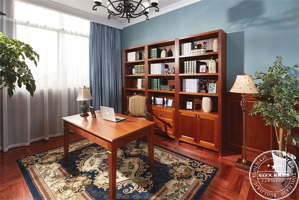 ▲伯格莊園系列書房,整體紅橡木本色,色彩濃郁,呈現(xiàn)出一種古典美感。伏案覽書,別有滋味。