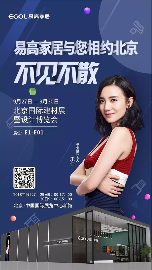 2018年9月27-30日,為期4天的北京國際建材展暨設計博覽會在北京·中國國際展覽中心(新館)即將舉辦。這次博覽會是國內首創的以“設計+智能+定制”為導向的高端家裝建材全品類大展。屆時,易高家居將攜新品再度亮相,給您全新的定制家居體驗!