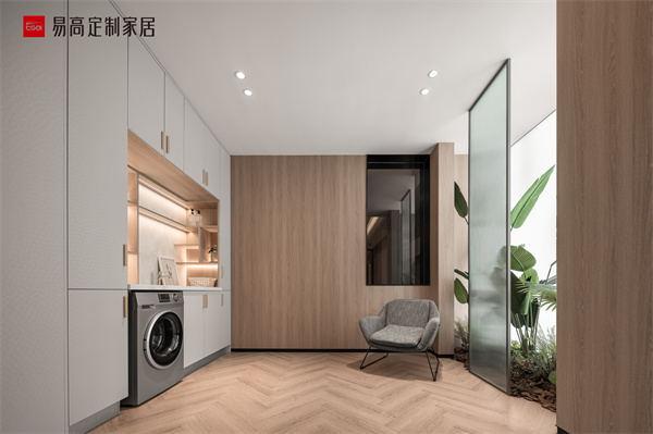 作為室內空間的鏈接紐帶,陽臺采用滿墻收納柜設計,注重功能整合,打造理性有序的空間節奏。玻璃格柵引光入景,被陽光親吻過的家,浪漫且富足。生活之美,不言而喻。