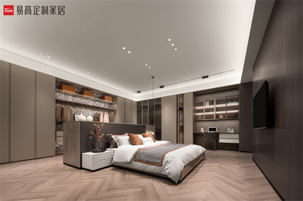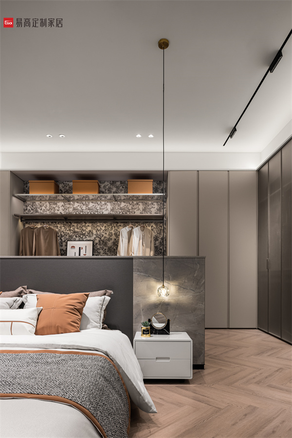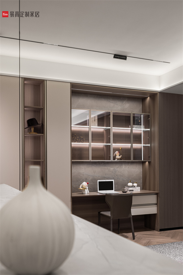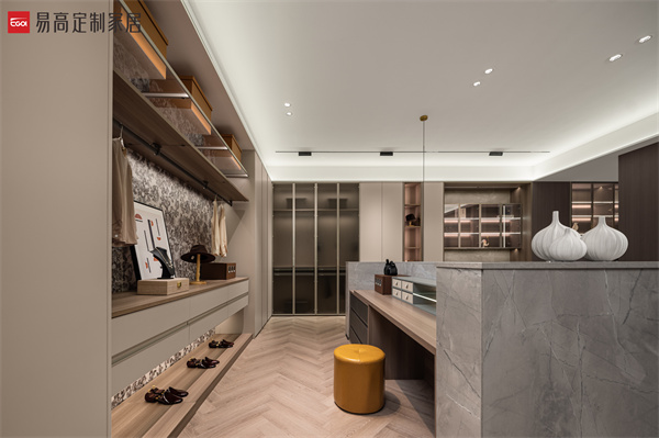 半開放收納體系滿足對私密空間的多樣追求,以克制簡潔的線條,鋪設出素簡、立體的空間肌理,在燈光渲染下延伸出和諧寧靜的光影之美。實用的細節處理和明確的功能劃分,詮釋精致有序的生活方式。