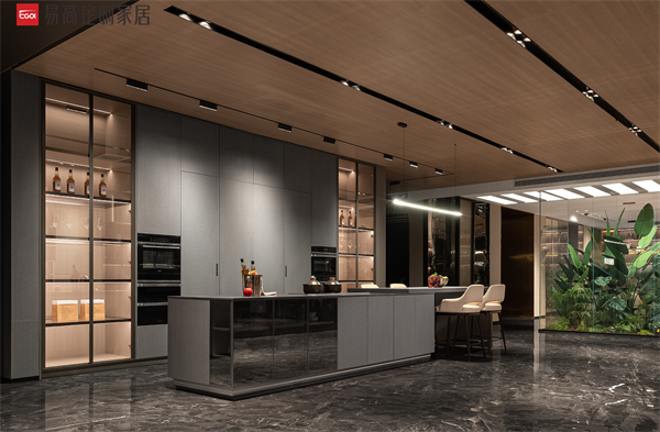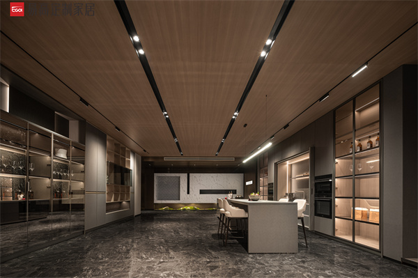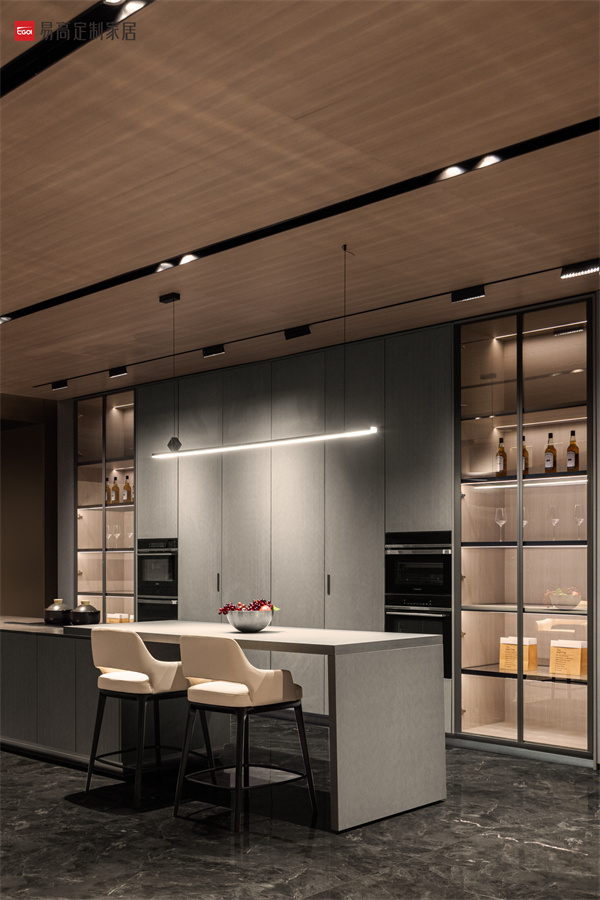 開放式西廚設計高端大氣,深灰色系的大面積鋪就暈染出神秘深邃的空間氛圍,體現對都市質感生活的不懈追求。裝飾頂柜背板采用前后錯位設計,在燈光和玻璃的折射作用下將空間立體感層層推進,凸顯深厚的家居美學底蘊。