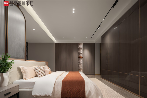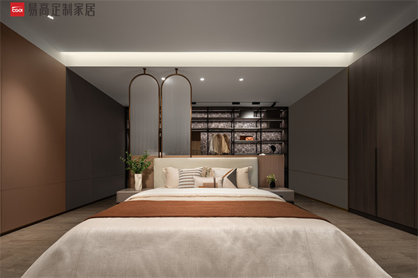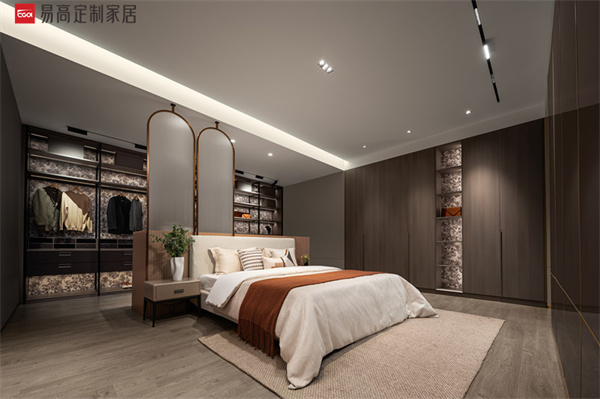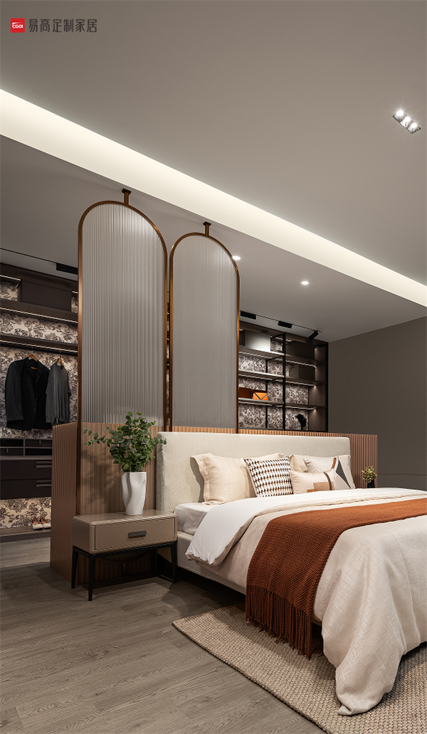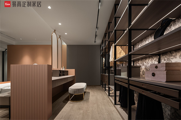 整個空間以利落的線條有序勾勒,盡顯奢雅的貴族姿態。掛衣區、收納區、梳妝區、休息區功能劃分明確,實現美學性和實用性的微妙平衡。背板獨特的絨花噴繪工藝,為空間注入不一般的時尚張力,如一幅藝術畫卷悄然綻放,熱情、悠然、不羈。