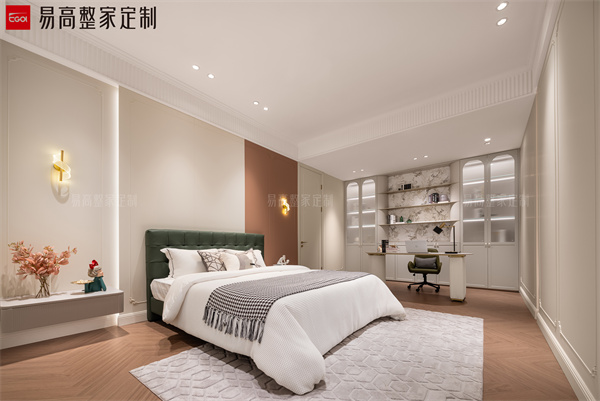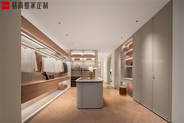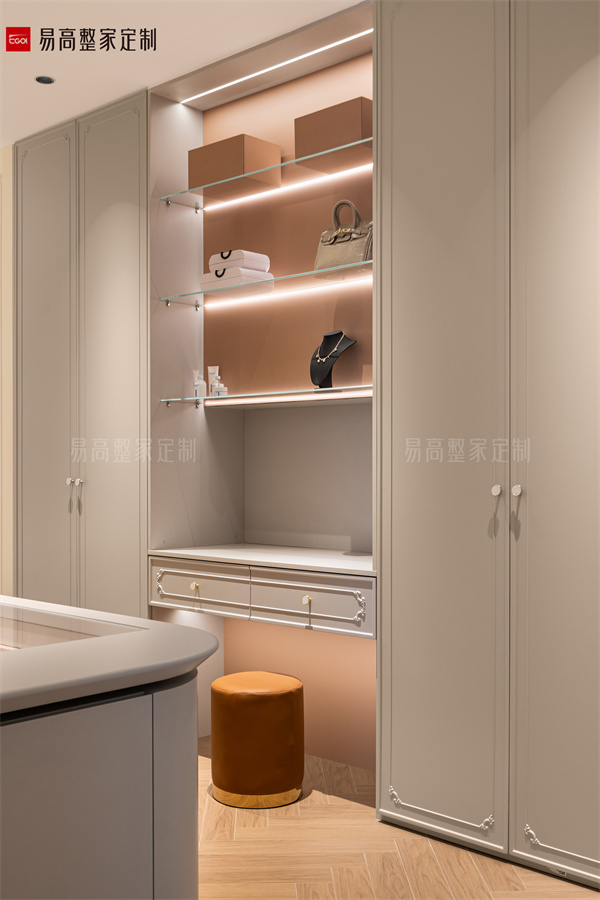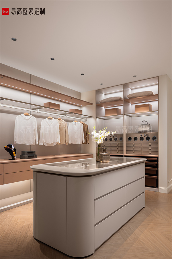 設計師巧妙運用直線和曲線的交匯,創(chuàng)造出剛柔并濟的大氣美感。開放式衣帽間系統(tǒng)和升降梳妝臺藏露有序,將空間層次層層推進。流動的步履中,舉手投足間都縈繞著奢雅、隨性的氣息,舒享品質人居。