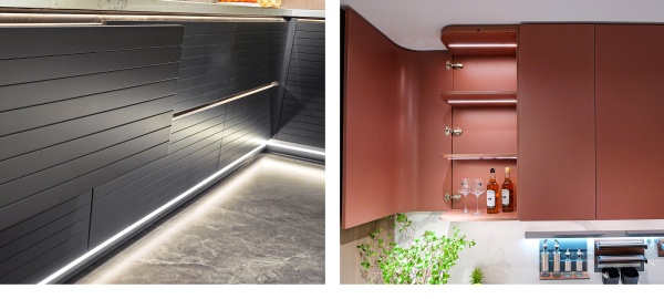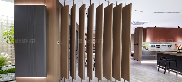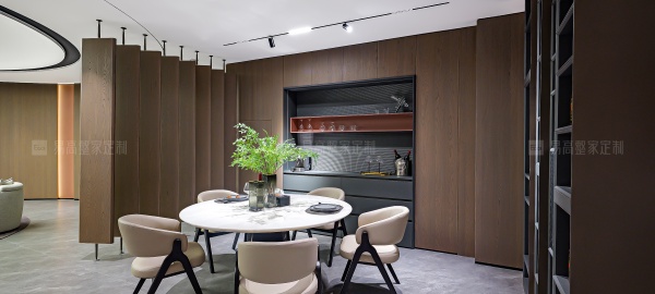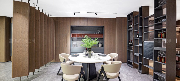 通透的屏風(fēng)和開(kāi)放格設(shè)計(jì)相輔相成,呼吸感穿梭其中,生動(dòng)演繹意式美學(xué)的優(yōu)雅與從容。線性燈帶沿著柜體輪廓隨性流淌,明暗交匯間,無(wú)限放大光影美感。